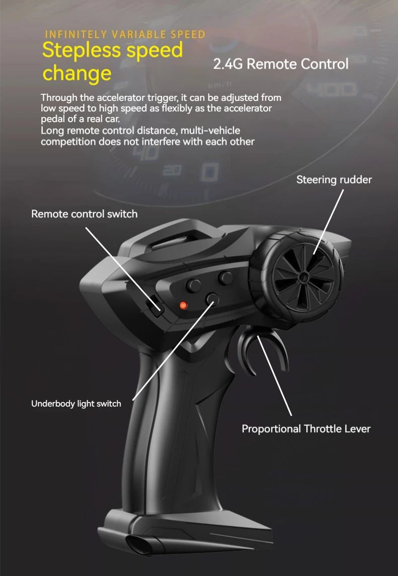 【4WD System and Full Proportional Throttle】The drift car has a four-wheel drive system that allows for more stable drifting. It is also equipped with a full proportional throttle that allows you to control all the speed you want. So you can easily make the drifting stunts, such as tail flipping and spinning.