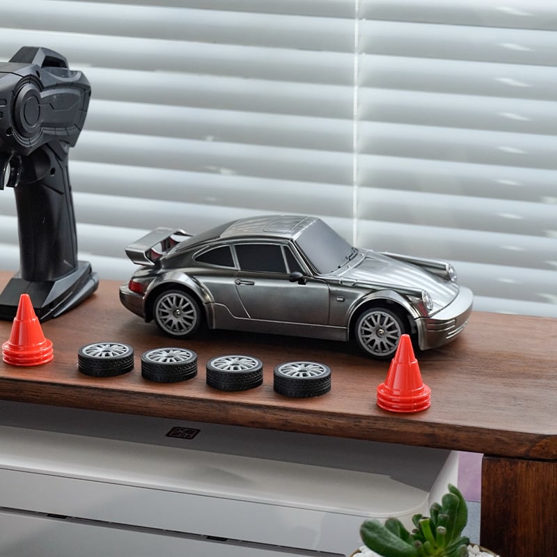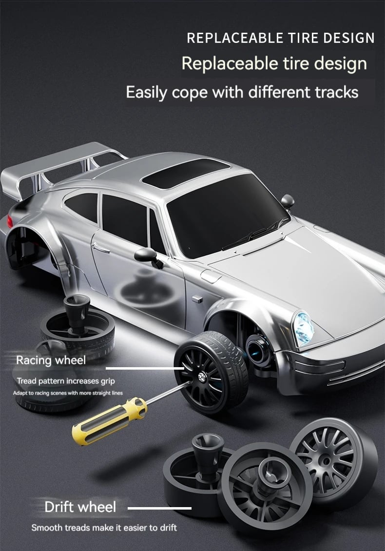 【With Lights and Two Kinds of Tires and Accessories】Equipped with headlights and taillights, it looks better and can be played at night. Equipped with two kinds of car tires (drifting wheel and racing wheel), you can choose according to different terrain.Using the barricade accessory, you can practice and race.